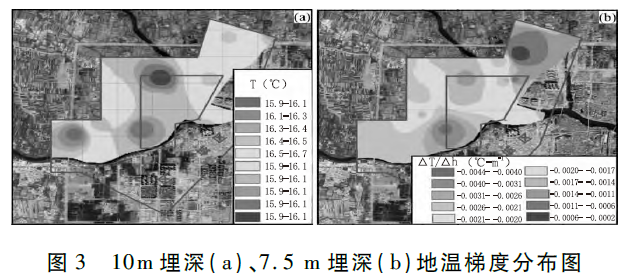 考慮淺部地溫受多因素影響,為有效識(shí)別淺層地溫異常區(qū)域,本次求取了7.5m埋深處地溫梯度公式(1),并繪制了7.5m埋深地溫梯度暈圖。由圖3(b)可見(jiàn)可見(jiàn),7.5m埋深