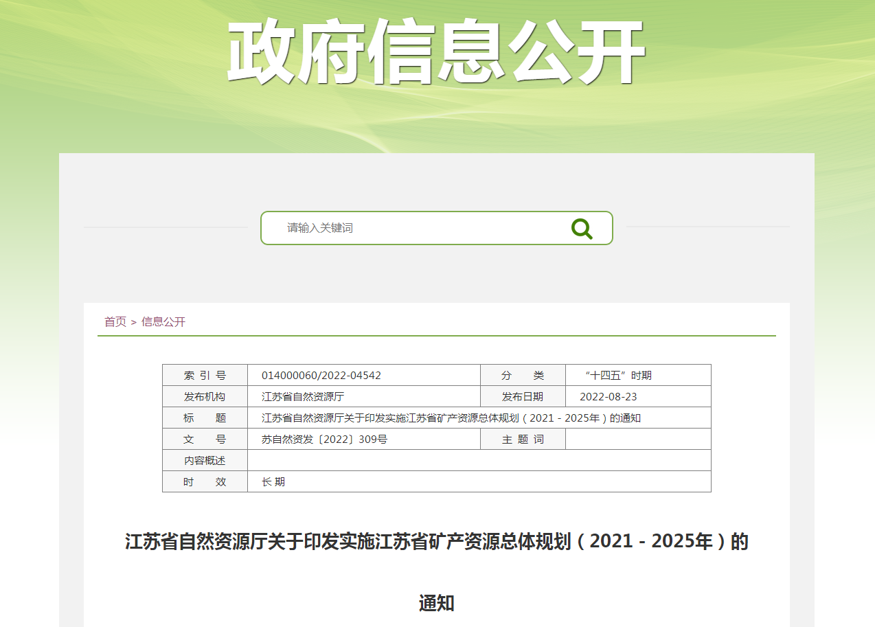 地大熱能地?zé)崮荛_發(fā)利用:《江蘇省礦產(chǎn)資源總體規(guī)劃(2021-2025年)》(以下簡稱《規(guī)劃》)業(yè)經(jīng)自然資源部批準(zhǔn),并經(jīng)江蘇省政府同意,近日印發(fā)。