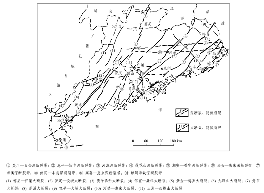 廣東省在大地構(gòu)造上屬華南褶皺系的一部分,其演化過程經(jīng)歷了三個(gè)發(fā)展階段及相應(yīng)的構(gòu)造旋回和構(gòu)造運(yùn)動(dòng):加里東運(yùn)動(dòng)形成緊密線型褶皺,主要呈NEE方向,成為廣東省構(gòu)造骨架的基礎(chǔ);印支運(yùn)動(dòng)形成多方向的過渡型蓋層褶皺;燕山運(yùn)動(dòng)以斷塊造山、NE向和EW向深大斷裂控制的火山噴發(fā)、巖漿侵入為主。深大斷裂對(duì)廣東省的沉積建造、巖漿活動(dòng)、變質(zhì)作用和成礦作用有較明顯的控制。主要的深斷裂有吳川-四會(huì)、恩平-新豐、河源、蓮花山、潮安-普寧、汕頭-惠來、南澳、佛岡-豐良、高要-惠來、瓊州海峽等,主要的大斷裂有郴縣-懷集、羅定-悅城、貴子、信宜-廉江、紫金-博羅、九峰山、貴東、遂溪、饒平-大埔、河婆-惠來、三洲-西樵山等。這些深大斷裂都具有規(guī)模大、活動(dòng)時(shí)間長等特點(diǎn)。從總體上看。廣東省境內(nèi)大型褶皺和深大斷裂以NE向?yàn)橹鳎g夾EW向和NW向構(gòu)造組成復(fù)雜的構(gòu)造圖景。