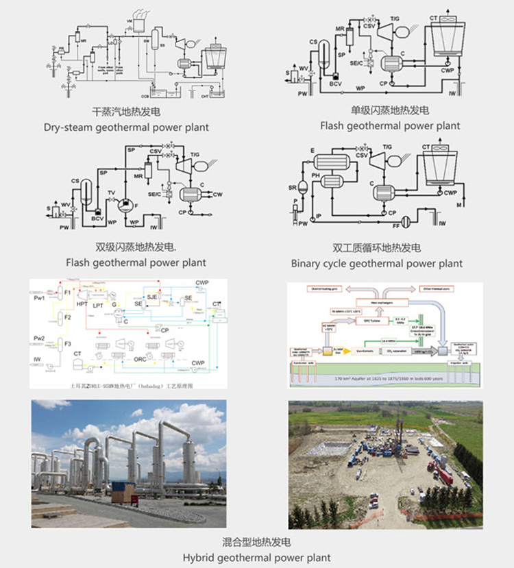 地?zé)岚l(fā)電需根據(jù)地熱流體的溫度、壓力以及它們的水、汽品質(zhì)的不同而采取不同的設(shè)計(jì)方案。其主要類型包括:干蒸汽地?zé)岚l(fā)電、單級(jí)閃蒸地?zé)岚l(fā)電、雙級(jí)閃蒸地?zé)岚l(fā)電、一井一站地?zé)岚l(fā)電、混合型地?zé)岚l(fā)電、雙工質(zhì)循環(huán)地?zé)岚l(fā)電、干熱巖發(fā)電。