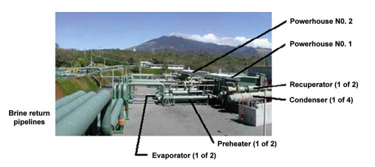 米拉瓦列斯的五號發(fā)電機組是2004年剛投入使用的。這個發(fā)電機利用從一號和二號和三號發(fā)電機組中的廢棄鹵水,通過注入井來獲取了可能回到熱儲層中的能量??偣驳陌l(fā)電量是15.5MW,發(fā)電機組中的每一個發(fā)電單元都發(fā)出7.75MW的電。每一個發(fā)電單元是有兩個渦輪組成的,驅動同一個發(fā)電機。循環(huán)工質是常規(guī)的正戊烷,C5H12。每一個單元用兩個預熱器。兩個蒸發(fā)器跟他們各自的分隔板。兩個回熱器,四個水冷凝器。這個發(fā)電機組是有澳瑪特(Ormat)提供的。