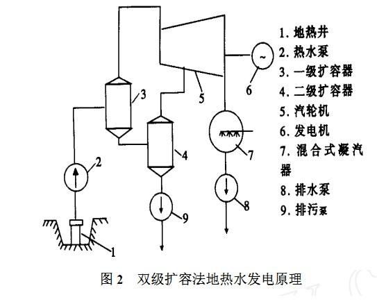 西南電力設(shè)計院設(shè)計的羊八井地熱電站第1臺試驗機組,容量為1000kW,汽輪機是利用四川內(nèi)江電廠2500kW廢棄設(shè)備改造而成。于1977年10月試運成功,采用單級擴容法熱力系統(tǒng)。若把地熱水送入1個密閉的容器中降壓、擴容,根據(jù)水沸點與壓力的關(guān)系,可使溫度不太高的地熱水因氣壓降低而沸騰變成蒸汽。由于地熱水降壓蒸發(fā)的速度很快,是一種閃急蒸發(fā)過程;同時,地熱水蒸發(fā)產(chǎn)生蒸汽時,其體積迅速擴大,所以該容器稱為“擴容器”或“閃蒸器”。用這種方法產(chǎn)生蒸汽來發(fā)電稱為擴容法地熱水發(fā)電。這是利用地熱田熱水發(fā)電的主要方式之一,該方式分單級擴容法系統(tǒng)和雙級(或多級)擴容法系統(tǒng)。擴容法系統(tǒng)的原理是:將地熱井來的中溫地熱汽、水混合物,先送到擴容器中進行降壓、擴容(稱閃蒸),使其產(chǎn)生部分蒸汽,蒸汽經(jīng)過分離器除去雜質(zhì)(10μm及以上)后,再引到常規(guī)汽輪機機發(fā)電。